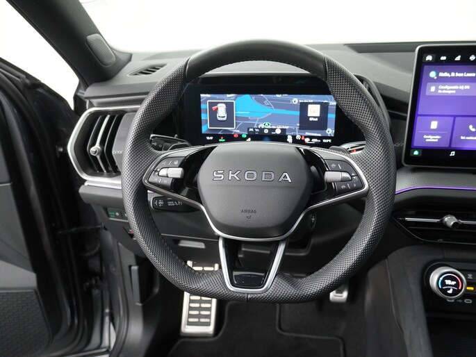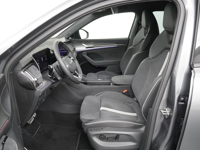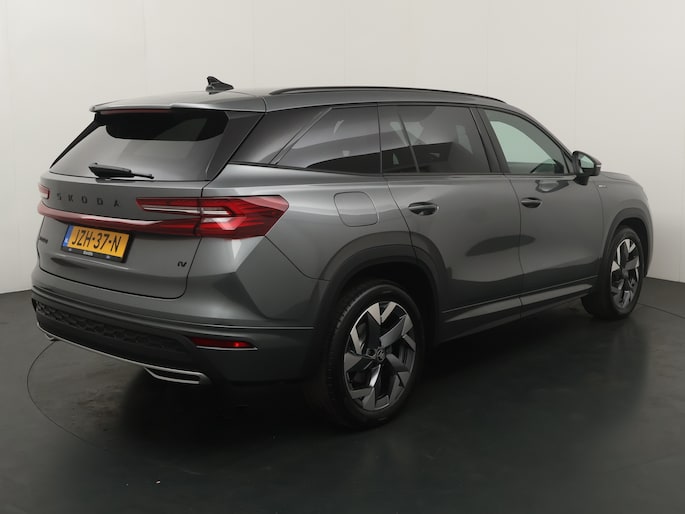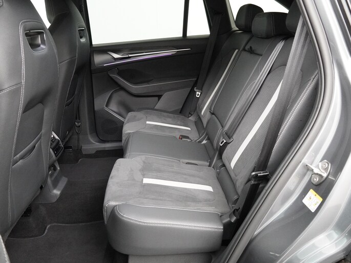 De Sportline uitvoering is de sportieve versie van de Kodiaq. Dat is aan de buitenkant meteen te zien aan de speciale wielen en zwarte accenten. De spiegelkappen, dakrails en grille zijn gelakt zwart. Het geeft een mooi contrast met de donkergrijze buitenkleur. In de grille zitten LED lampen die de auto in het donker extra uitstraling geven. Ook het interieur is bijzonder. De auto heeft zeer fraaie sportstoelen. De bestuurdersstoel is elektrisch verstelbaar en kent 3 geheugenstanden. Zo kunnen verschillende bestuurders hun favoriete positie opslaan. Het dashboard, deurpanelen en middenconsole zijn afgewerkt met alcantara. Het geeft een zeer luxe uitstraling. De hemelbekleding is heel donkergrijs. Beide voorstoelen èn de achterbank zijn elektrisch te verwarmen. Ook het stuurwiel is verwarmbaar. Zo is het in de winter vanaf de eerste meters comfortabel. Het is zelfs mogelijk om de auto op afstand voor te verwarmen of te koelen. De klimaatregeling is digitaal in te stellen. De passagiers op de achterbank hebben hiervoor een eigen paneel. Bovendien zijn zowel voor als achter 2 USB aansluitingen voor de elektronica. Voor is het zelfs mogelijk om 2 mobiele telefoons tegelijk draadloos op te laden.