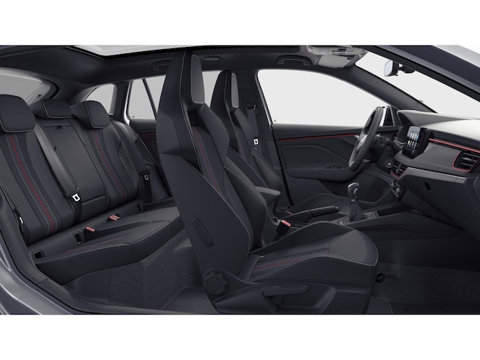 - Interieur "Monte Carlo" met zwart stoffen/suedia bekleding en sportstoelen