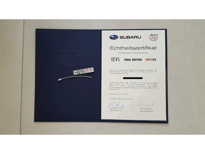 De Subaru WRX STI Final-Edition is in 2018 gebouwd in oplage van het magische getal "555" stuks, welke verdeeld zijn over alle werelddelen waar de WRX STI werd verkocht. In Europa waren het er naar verluidt niet meer dan 200, waarvan uiteindelijk geen één officieel Nederland bereikte vanwege het absurde BPM-regime. Van deze 200 Final-Editon’s werden er 122 in Duitsland verkocht en in 2 kleuren geleverd namelijk Crystal Black Mica en WR Blue Pearl . De Duitse importeur heeft, in overleg met Subaru Corporation Japan, destijds gemeend om deze speciale uitvoering en állerlaatste serie uniek te nummeren. Dat wil zeggen dat slechts 122 van de 555 officieel genummerd zijn. Alleen deze STi’s zijn voorzien van een Final-Edtion badge met een eigen nummer op de middenconsole, een bijbehorend authentiek certificaat met vermelding nummer & VIN en uniek genummerde sleutelhanger. Je zult begrijpen dat dit summum is voor de échte liefhebber en voor de verzamelaar!
