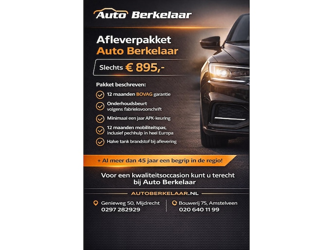 De door ons genoemde communicatieadviesprijzen zijn inclusief onvermijdbare kosten welke nodig zijn voor aflevering van de auto. Hieronder vallen een vloeistoffen controle en de tenaamstelling van de auto. Daarnaast is de auto voorzien van een APK keuring van minimaal 3 maanden. Het optionele Berkelaar Zekerheidspakket is altijd de keuze van de consument en kan desgewenst tegen meerprijs geleverd worden. Wilt u deze auto van dichtbij bekijken en ervaren hoe hij rijdt? Wij ontvangen u graag in onze showroom. Wij hebben een ruime keus aan occasions. * De voorwaarde is: Bovag garantie is van toepassing bij aanschaf van ons zekerheidspakket à € 895,-