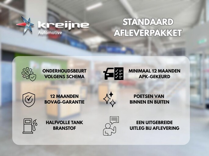 Dit afleverpakket bevat: BOVAG garantie (12 maanden); BOVAG 40-Puntencheck; BOVAG Afleverbeurt; Nieuwe APK; 24 uurs Pechhulp, Onderhoudsbeurt volgens fabrieksschema