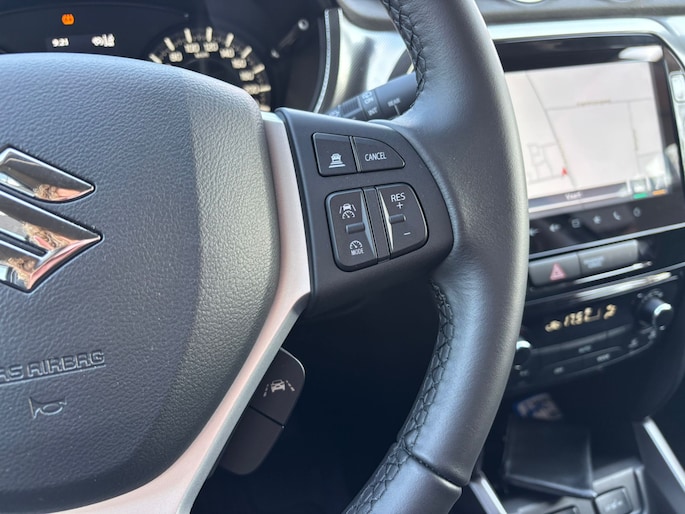 Niets achter deze auto blijft verborgen door de achteruitrijcamera. Een veilig gevoel! Met adaptive cruise control houdt de auto zelfstandig afstand tot uw voorligger. Een veiligheidsverhogende optie waarmee u comfortabel onderweg bent. Deze auto gaat met u in gesprek. Hij vertelt u dankzij remote services alles over de status van diverse onderdelen en laat zich desgevraagd ook activeren. Gewoon via uw smartphone. U rijdt snel, zuinig en zeker naar uw bestemming met het full map navigatiesysteem. Aan boord van deze Suzuki Vitara is een achteropkomend verkeer waarschuwing voor extra veiligheid. Met electronic climate control, DAB ontvangst, regensensor, keyless entry, automatisch dimmende binnenspiegel en lederen stuur is deze auto helemaal compleet.