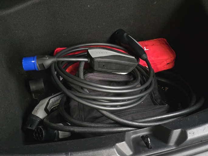 De Tesla wordt geleverd met reislader en laadkabel.