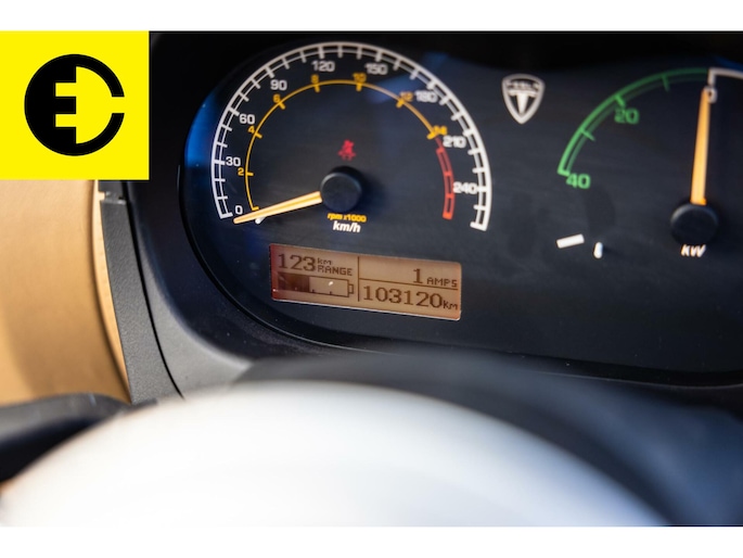 The first owner has always maintained the Roadster at Tesla Amsterdam. The then owner drove it a lot. Car had a battery problem a few years ago, which was fixed at Tesla. It is expected that the battery has been replaced. A new one had a CAC of 157Ah at the time and most of them had a CAC of around 140 after 20,000km. Most Roadsters have a CAC value between 110Ah and 135Ah.