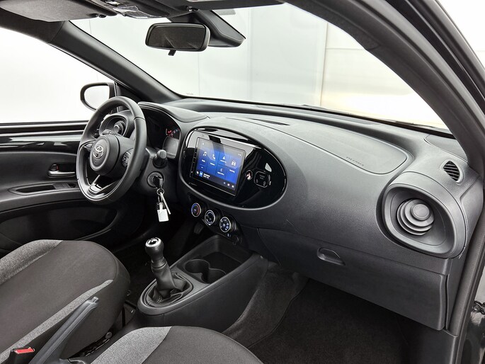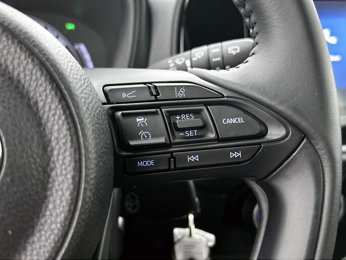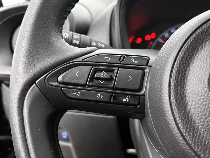 Zelfs een kleine aanrijding kan flinke kosten veroorzaken. Gelukkig laat de achteruitrijcamera precies zien wat er zich achter de auto bevindt en geeft een waarschuwingssignaal. Adaptive cruise control is een comfortabele en veilige optie. Het systeem reguleert de snelheid en houdt automatisch afstand tot jouw voorligger. Omdat je nu eenmaal niet overal ogen hebt, is deze Toyota Aygo X voorzien van een achteropkomend verkeer waarschuwing die registreert wanneer de afstand tot je achterligger te krap is. Met de DAB-ontvanger heb jij keuze uit talloze digitale radiozenders met de allerhoogste geluidskwaliteit. Met één druk op de knop blaast de airconditioning een koele bries door het interieur. De uitrusting van deze auto is met lederen stuur en centrale deurvergrendeling met afstandsbediening behoorlijk compleet.