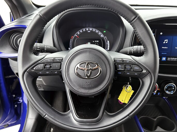 Deze compacte, comfortabele Toyota Aygo X is een typische stadsauto. Wendbaar, makkelijk te parkeren, pittig in rijgedrag en zuinig bovendien. Voor de aandrijving van deze auto zorgt een compacte motor. Verder is de Toyota uitgerust met: 17 inch lichtmetalen velgen, LED koplampen, donker getint glas achter en in delen neerklapbare achterbank.