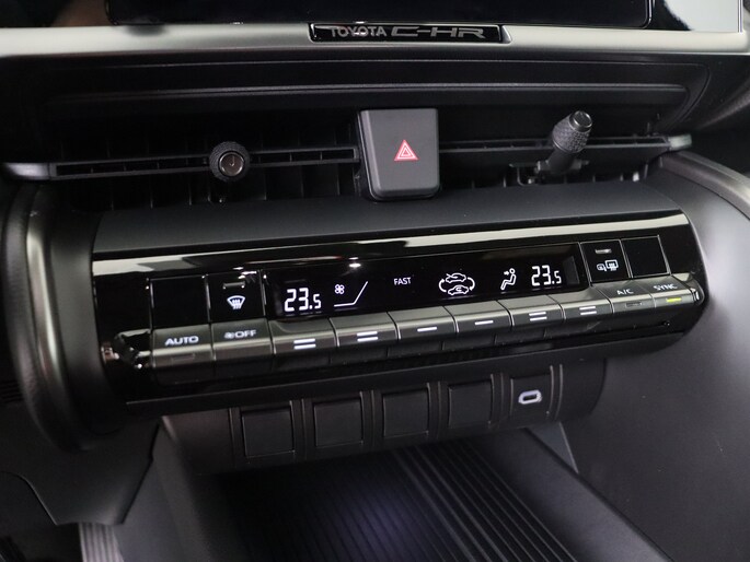 Kom maar, kom maar, kom maar... ho! Prettig hoor, zo'n achteruitrijcamera. Zoals je van zo'n jonge auto mag verwachten, zijn hier ook de geavanceerde remote services aanwezig. Simpelweg met een app op uw smartphone controleer je op afstand de status van de auto en bedien je diverse functies. Deze Toyota is voorzien van knoppen op het stuur om het audio-installatiesysteem met dab-ontvangst te bedienen. Omdat je nu eenmaal niet overal ogen hebt, is deze Toyota C-HR voorzien van een achteropkomend verkeer waarschuwing die registreert wanneer de afstand tot je achterligger te krap is. Electronic climate control verwarmt of koelt het interieur met een druk op de knop. Deze Toyota is voorzien van regensensor, keyless entry, buitentemperatuurmeter, automatisch dimmende binnenspiegel, centrale deurvergrendeling met afstandsbediening en verstelbaar stuur.