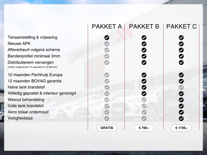 Onze auto's worden geadverteerd met standaard pakket A. Dit pakket omvat de tenaamstelling en een geldige APK. Optioneel kunt u kiezen voor afleverpakket B of C die zijn bijgevoegd bij de afbeeldingen.