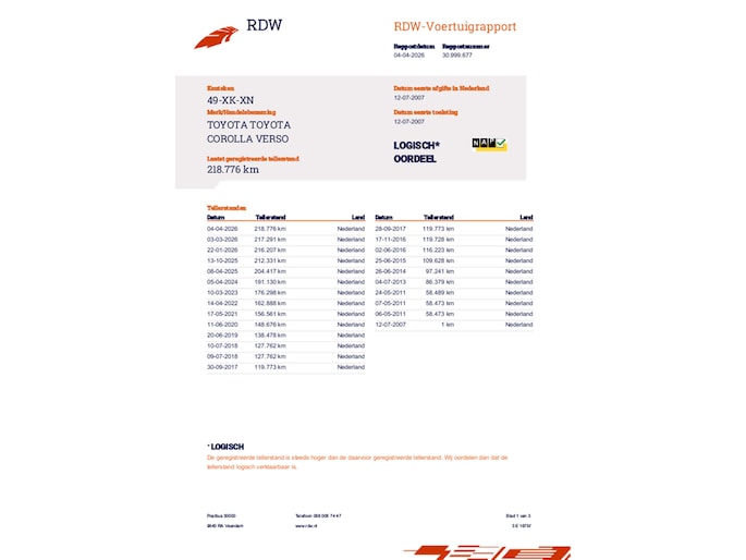Kilometerstand gecontroleerd