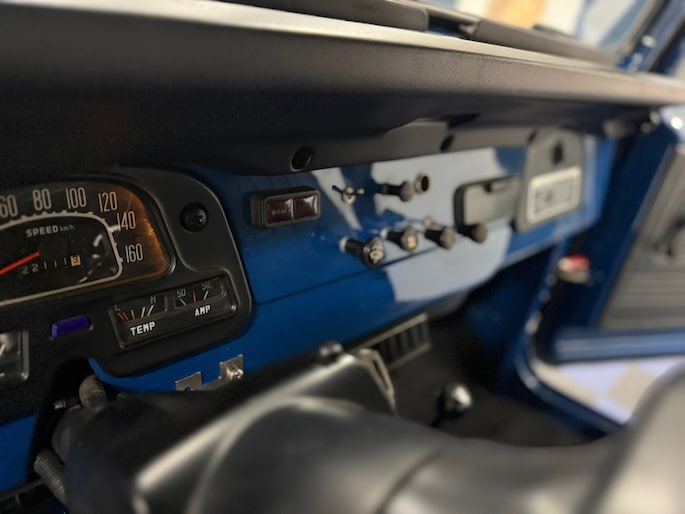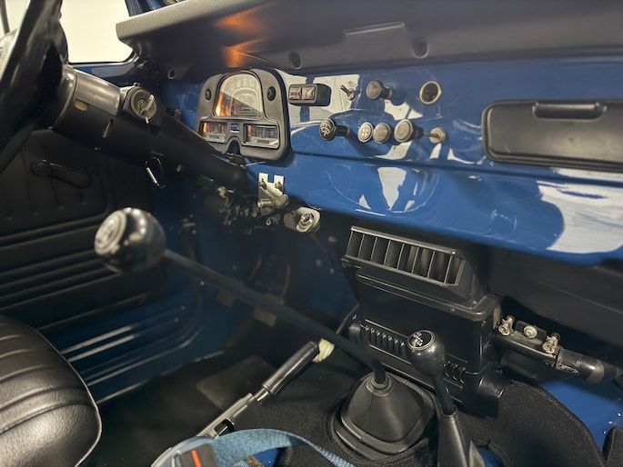Het stuurwiel, het dashboard, het instrumentenpaneel, de middenconsole met de versnellingspook en hoog/laagbediening verkeren in een originele en zeer goede staat.