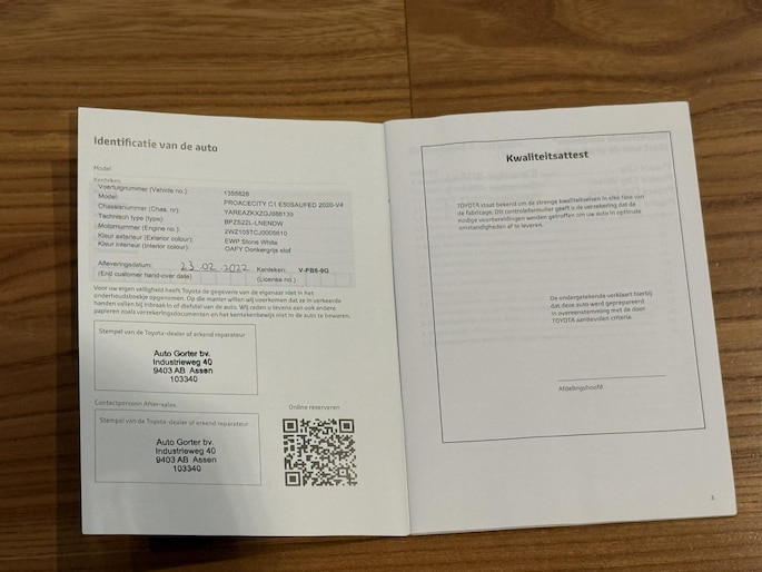 De Toyota werd origineel Nederlands geleverd en kende slechts één eigenaar. Alle documentatie is present evenals twee sleutels. De Toyota Service pas vermeld garantie tot en met 22.02.2027 of tot 200.000 km.