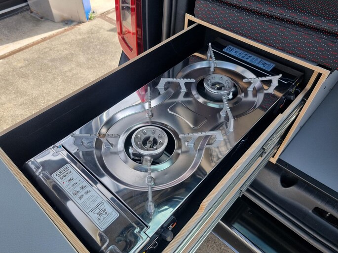 Deze box biedt naast een 2 persoons bed met loungestand een zitje, koelkast, 2-pits kooktoestel, spoelbak, besteklade, watertank en klein aankoppelbaar bijzettafeltje. Verder is er een walstroom aansluiting met wandcontactdoos + aardlekschakelaar gemonteerd en hangen en gordijnen rondom.