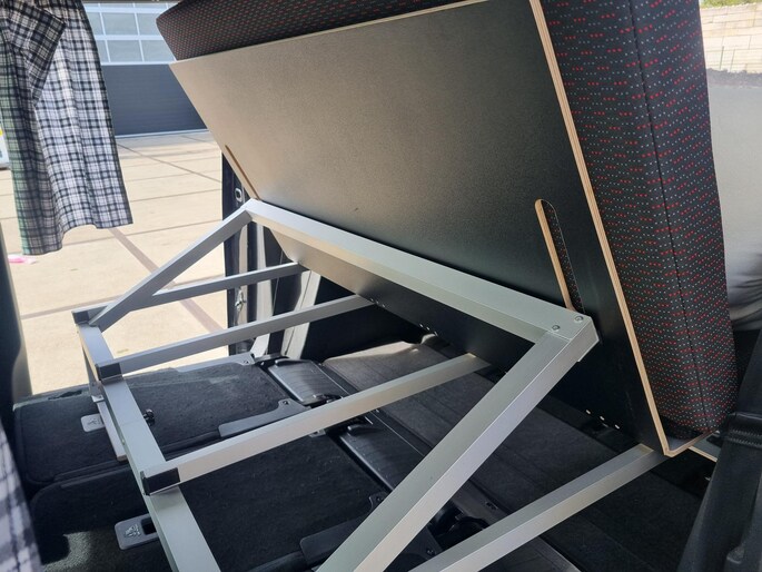 Het bed is eenvoudig op te klappen zodat de achterbank weer kan worden gebruikt. Ook is de gehele box te verwijderen wanneer er niet gekampeerd wordt.