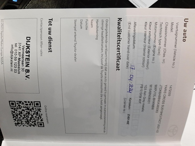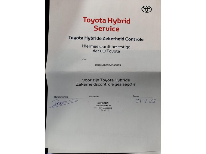 Optioneel afleverpakket (zonder meerprijs): Toyota Approved: • 12 maanden "Toyota approved" garantie (Tot 10 jaar verlengbaar*) • 24/7 Pechhulp Europa dekking • Garantiedekking heel NL • 14 dagen tot max. 1000 KM omruilgarantie • Tenaamstelling/vrijwaring • Reiniging in- & exterieur • Hybride Zekerheid Controle • Toyota kwaliteitschecklist • Gecontroleerde KM-stand • Vloeistoffencheck & bijvullen • Poetsbeurt • Onderhoud conform schema • Nieuwe APK • Gratis vervangend vervoer Ja** *Informeer naar de geldende voorwaarden **Bij reparaties die langer dan 24 uur duren. Gratis vervangend vervoer kent een maximale duur van 72 uur.