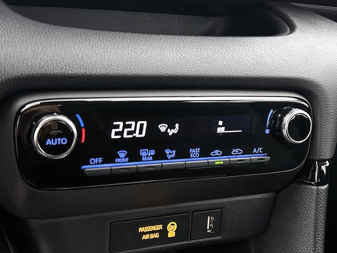 De Toyota Yaris is jouw trouwe partner onderweg, want hij houdt continu voor jou de situatie op en om de weg in de gaten. Volautomatische veiligheidssystemen kunnen daarbij ingrijpen om je voor gevaarlijke situaties te behoeden. Verkeersbord-detectie herkent verkeersborden en toont deze op het instrumentarium van de auto. Deze Toyota Yaris is ook behulpzaam als het gaat om een rechte koers. Het Lane-keeping systeem signaleert en corrigeert als je onbedoeld de rijstrooklijnen dreigt te overschrijden. Veel aanrijdingen bestaan uit kop-staartbotsingen. De forward collision warning reduceert dat risico aanzienlijk. De veiligheid van deze auto wordt verder verhoogd door hill hold functie, brake assist en bandenspanningcontrolesysteem.