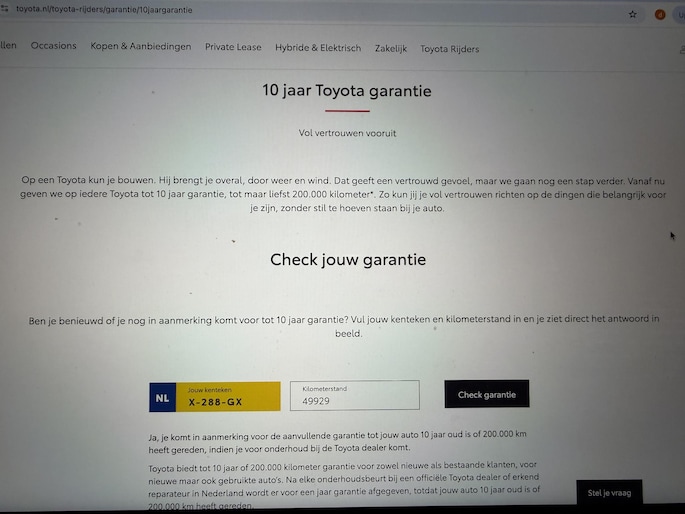Daarnaast komt deze Yaris in aanmerking voor de 10 jaar Toyota fabrieksgarantie (zie laatste foto), mits het onderhoud bij de Toyota dealer uitgevoerd blijft worden. Dat betekent zorgeloos rijden tot augustus 2030 of tot 200.000KM wat het eerst bereikt wordt. ( https://www.toyota.nl/toyota-rijders/garantie/10jaargarantie )