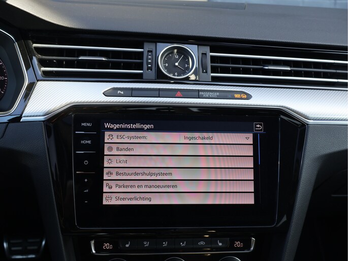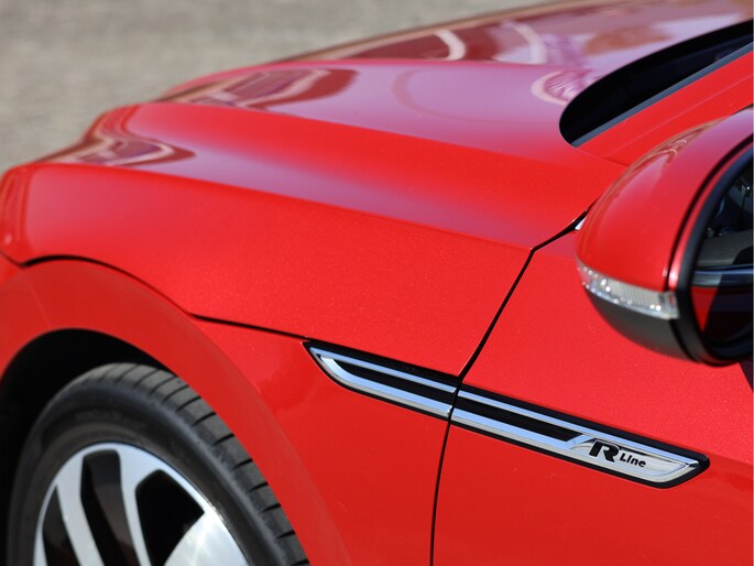 Het eerste wat opvalt, is de krachtige lijn van het coupédesign, versterkt door de R-Line accenten. De 19 inch lichtmetalen velgen, de subtiele maar agressieve bumpers en de sportieve details rondom geven deze Arteon een uitstraling die je normaal alleen bij echte performance-modellen ziet. De LED-verlichting met dynamische knipperlichten maakt het plaatje compleet – modern, strak en herkenbaar, zowel overdag als in het donker. Dit is geen doorsnee zakenauto, dit is een visitekaartje op wielen.