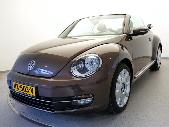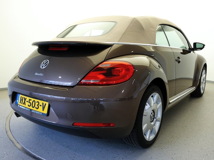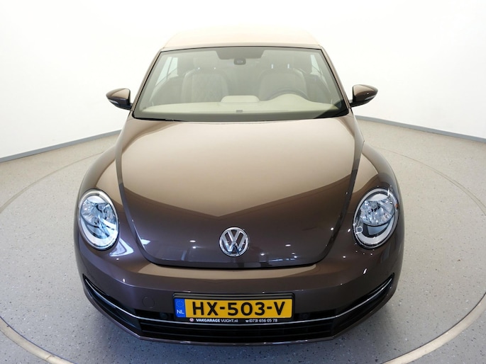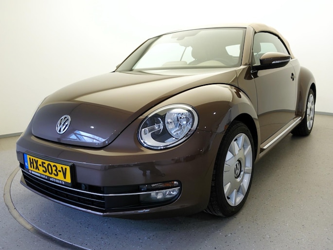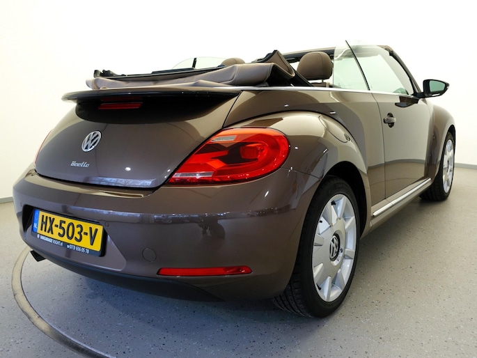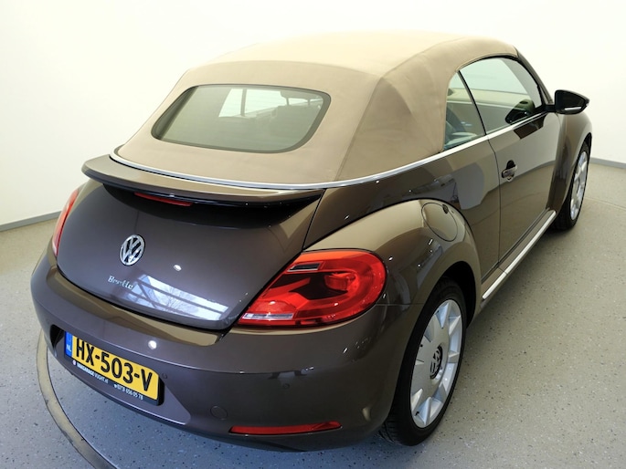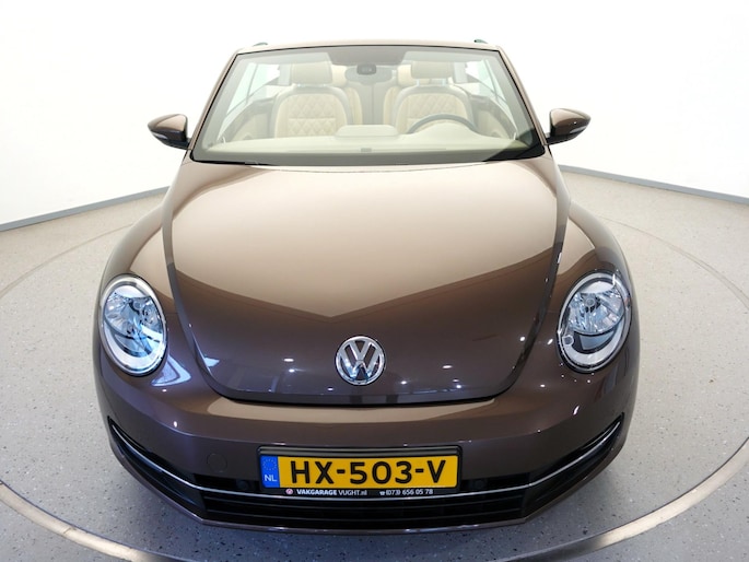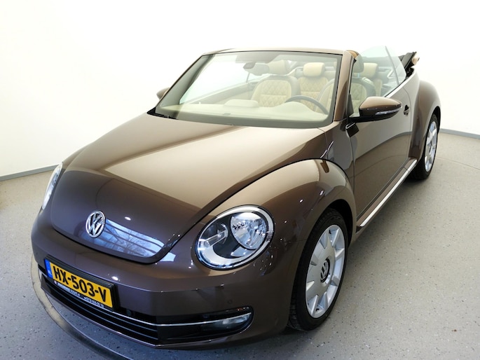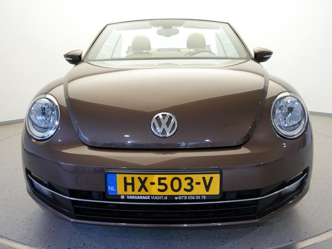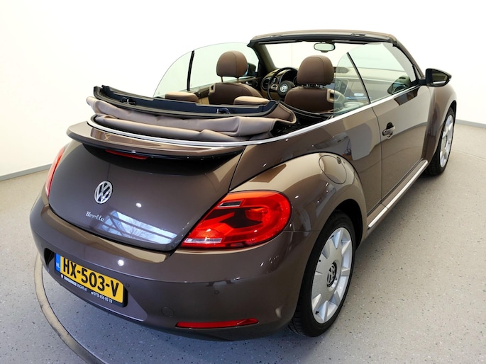 Unieke, van de 1e eigenaresse afkomstige, retro VOLKSWAGEN BEETLE Cabriolet met een 105pk sterke 1.2 TSi benzinemotor, zeer aantrekkelijk lage kilometerstand van slechts 50.000 km in de luxe vintage "Design Edition Executive Plus"-uitvoering met o.a. airco met dual-zone climate control, elektrisch bediend softtop cabriodak, gedistingeerd beige/bruin leder interieur, elektrisch verstelbare en verwarmbare buitenspiegels, afstandsbediende centrale deurvergrendeling met geïntegreerde schakeling van het originele alarmsysteem, origineel "Composition & Discover" multimediasysteem met radio/CD/MP3-speler, 8 speakers, fullmap navigatiesysteem, Bluetooth handsfree telefoon- en audiokoppeling, spraakbediening en USB-, AUX- & SD-card input, in hoogte en lengte verstelbaar, multifunctioneel lederen stuurwiel, in hoogte verstelbare en verwarmbare comfortstoelen met middenarmsteun, licht- en regensensor, automatisch dimmende binnenspiegel, mistlampen en statische bochtverlichting in voorbumper, parkeersensoren voor en achter met displayweergave, 18-inch 70's lichtmetalen velgen met anti-diefstalbeveiliging en reservewiel, origineel windscherm, metallic-lak in retrokleur "Toffee Brown", etc.