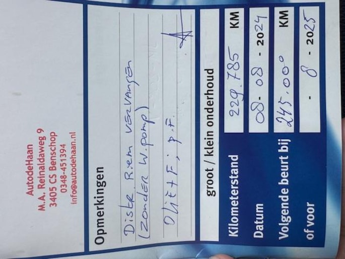 Distributieriem vervangen op 08-08-2024 bij km stand 229.785