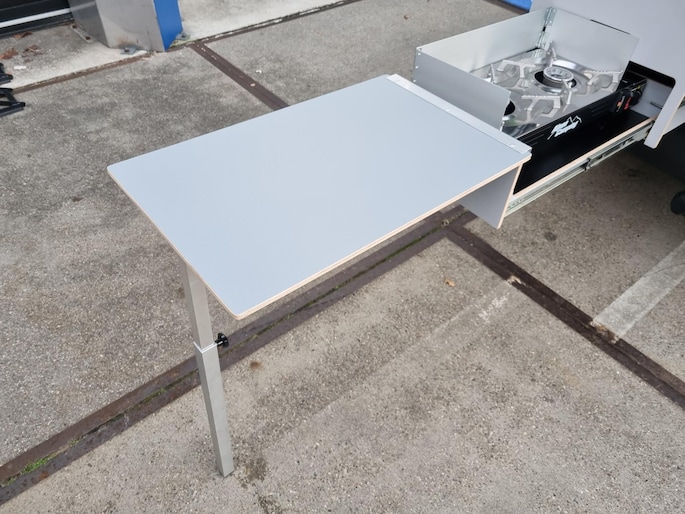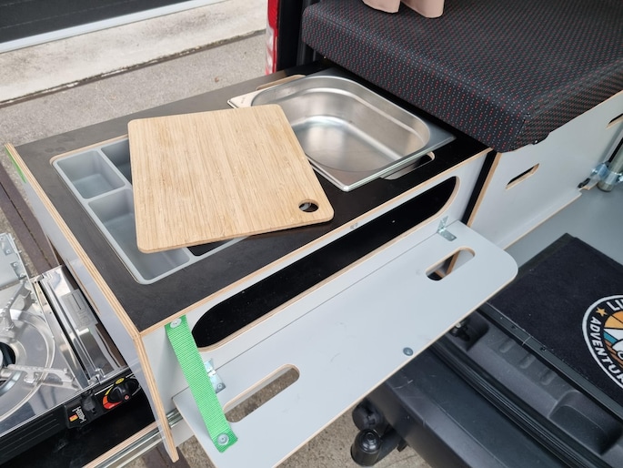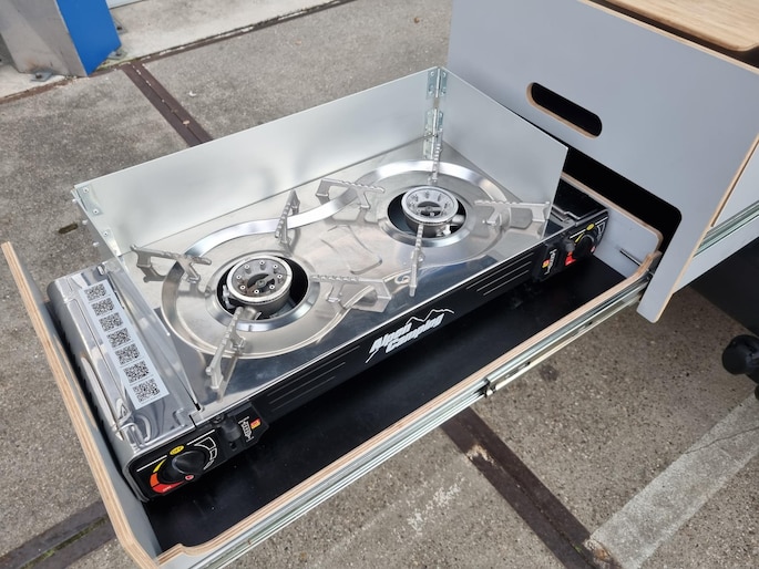 De Caddy is door de firma 3dotzero uit Baarn voorzien van een spiksplinternieuwe 1 persoons Mobi Kitchenbox