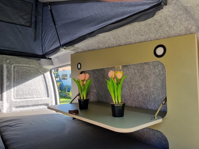 Deze Volkswagen Caddy L2H1 Maxi 1.0 TSI St. Tropez is voorzien van een nieuwe camperinrichting by Discoverbox. Deze inrichting biedt de mogelijk om van het ruime 2 persoons bed (L. 1,95 m / B. 1,35 m) in een handomdraai een comfortabele zitbank te maken waar je goed en relaxed kunt zitten. In de kastenwand tegenover de bank zit een ruime klep geïntegreerd welke o.a. handig kan zijn voor het gebruik van een laptop.