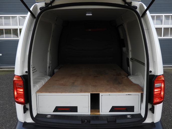 Nette Volkswagen Caddy 2.0 TDI maxi DSG met veel opties, degelijke ladekasten in de laadruimte, mooie velgen en af fabriek standkachel met afstandsbediening!