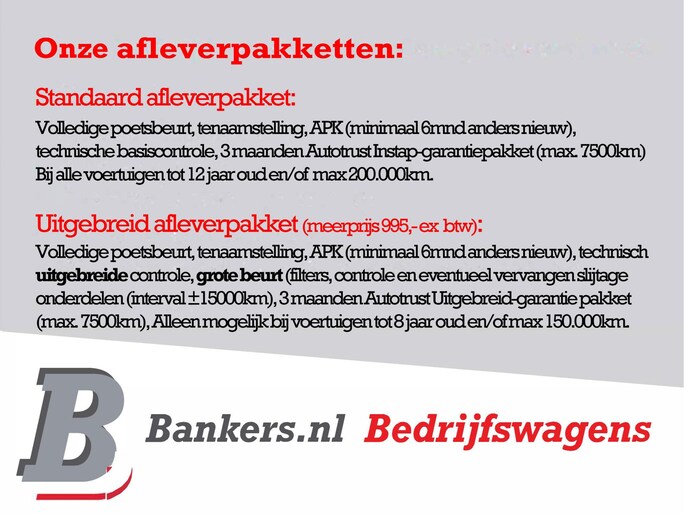 Dit afleverpakket bevat: Autotrust Instap-pakket (3 maanden garantie, 7.500 km garantie) - Uitgebreid pakket (€ 995 ex BTW meerprijs): Uitgebreid afleverpakket: minimaal 6 maanden APK (anders nieuwe APK), tenaamstelling, poetsbeurt, afleverbeurt en 3 maanden Autotrust uitgebreid garantie (max 7500km). Dit pakket is alleen mogelijk op alle auto’s jonger dan 8 jaar en minder dan 150000km voor de meerprijs van 995,- ex.