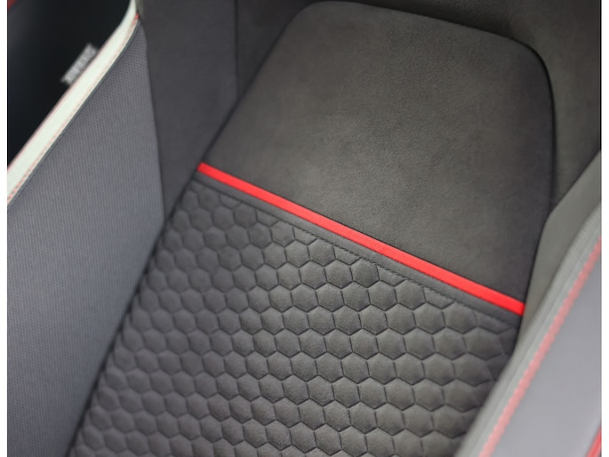 In het interieur vinden we Alcantara sportstoelen met honinggraatbedrukking en meer rode accenten. De sportstoelen bieden optimale steun wanneer u deze auto gebruikt waar hij voor bedoeld is. Daarnaast zijn ze voorzien van stoelverwarming zodat u ook op een koude ochtend van comfort geniet.