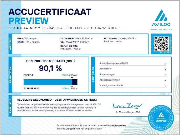 Bij Volkswagen draaien ze er niet omheen. Met dit exemplaar heb je een van de meest veelzijdige, complete auto's te pakken. U zult verrast zijn door de power van de elektromotor. En stil! Het zijn de degelijkheid van de constructie en de doordachtheid van het ontwerp die ervoor zorgen dat een Volkswagen jarenlang begeerlijk blijft. Zoals deze ID.3, bijvoorbeeld. Tijdens gure dagen is het prettig zitten in de verwarmbare voorstoelen. Als u de stuurverwarming inschakelt, geniet u van weldadige warmte voor uw handen en vingers. De koplampen zijn voorzien van matrix LED-verlichting waarmee u aanzienlijk verder kan kijken in het donker. Het systeem past zelf de lichtstraal aan op het moment tegenliggers verblind kunnen worden. Bij de uitrusting van deze Volkswagen horen onder meer 19 inch lichtmetalen velgen, extra getint glas, in delen neerklapbare achterbank, LED-achterlichten en snelheidsafhankelijke stuurbekrachtiging.
