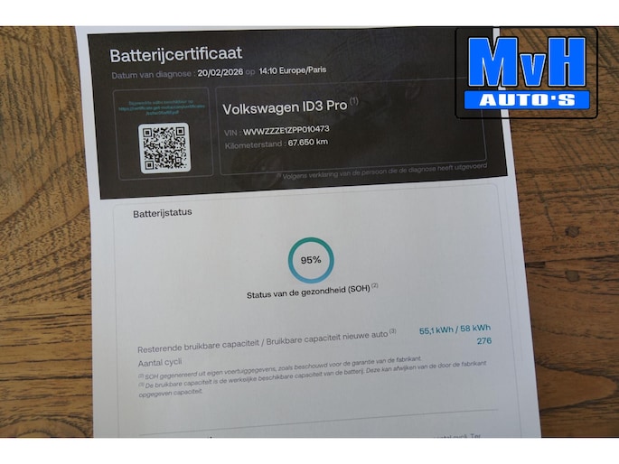 Deze auto heeft een SOH test van 95%. Zie foto van het rapport.