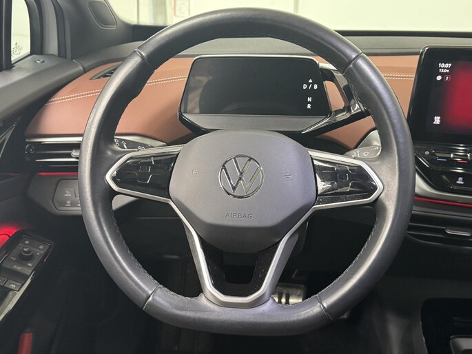 Een Volkswagen pik je er altijd uit, want je herkent hem aan zijn dynamische styling, aan zijn degelijke bouw en aan zijn sportieve lijnen. Dat geldt ook voor deze ID.4, die met zijn eigentijdse design helemaal past in het moderne straatbeeld. Met de combinatie van elektrische aandrijving en automatische transmissie manoeuvreert u soepel door het verkeer. Het zijn de degelijkheid van de constructie en de doordachtheid van het ontwerp die ervoor zorgen dat een Volkswagen jarenlang begeerlijk blijft. Zoals deze ID.4, bijvoorbeeld. Behaaglijk onderweg zijn? Als bestuurder geniet u van de verwarmbare voorstoelen. Net als uw bijrijder! Overdag een weidse zichthoek en 's avonds het lichtspel in de binnenruimte: dat geeft het glazen panoramadak! Comfortabel houvast krijgt u van het verwarmd stuurwiel. De koplampen zijn voorzien van matrix LED-verlichting waarmee u aanzienlijk verder kan kijken in het donker. Het systeem past zelf de lichtstraal aan op het moment tegenliggers verblind kunnen worden. Verder is de Volkswagen uitgerust met: 21 inch lichtmetalen velgen, geluidsisolerende ramen, in delen neerklapbare achterbank, LED-achterlichten, verwarmde ruitensproeiers en snelheidsafhankelijke stuurbekrachtiging.