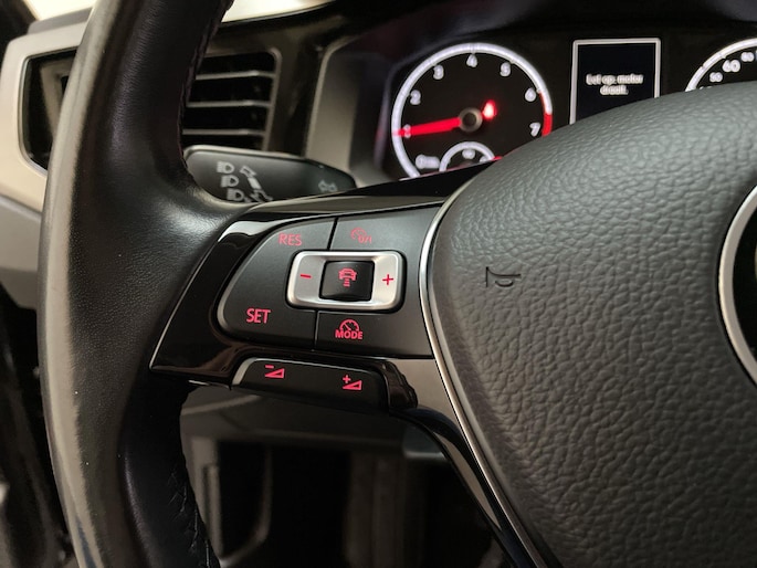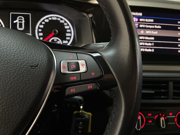Adaptive cruise control is veilig en comfortabel. De snelheidsregelaar houdt automatisch afstand tot het voertuig dat voor je rijdt. Deze Volkswagen Polo is voorzien van remote services. Via je smartphone bedien je diverse functies ook op afstand en krijgt je informatie over de status van je auto. Je kunt het audio-installatiesysteem met DAB-ontvangst en het navigatiesysteem bedienen met de knoppen op het stuur. De sensoren van de achteropkomend verkeer waarschuwing registreren wat er gebeurt in de dode hoeken en achter u. U krijgt meteen een waarschuwing als u een achterligger over het hoofd ziet. Superstrak parkeren wordt een eitje dankzij de parkeersensoren. Wat je ook in deze auto kunt vinden zijn airconditioning, lederen stuur, centrale deurvergrendeling met afstandsbediening, boordcomputer en lederen versnellingspook.