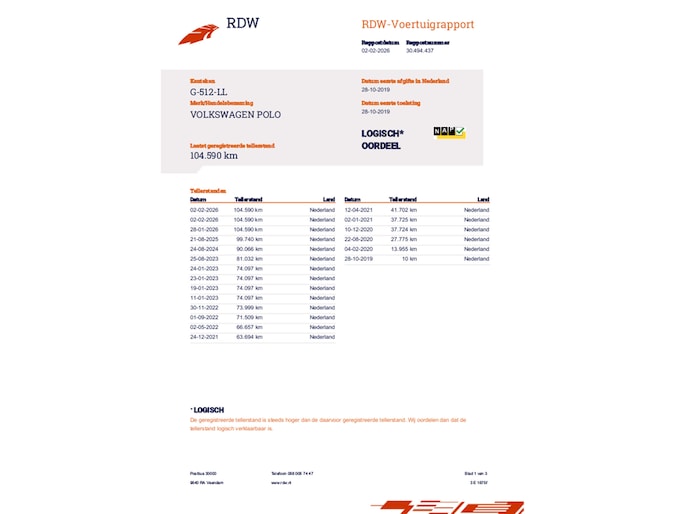 Kilometerstand gecontroleerd