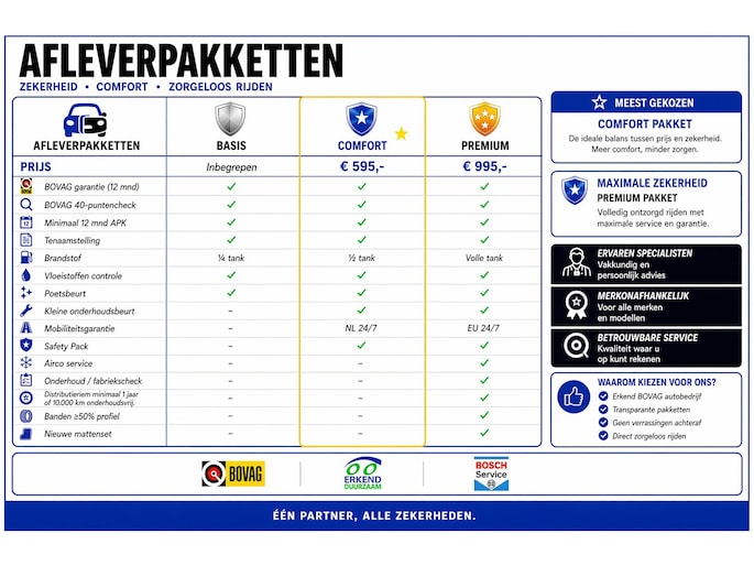 Dit afleverpakket bevat: BOVAG 40-Puntencheck; Nieuwe APK - Combi Comfort Pakket (€ 595):