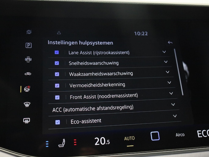 Aan boord van deze Volkswagen houden verschillende geavanceerde systemen voor u de weg in de gaten. Ze waarschuwen u voor noodsituaties en kunnen in een aantal gevallen ook zelf ingrijpen. Altijd uw blik op de weg: met de head-up display hoeft u geen moment uw ogen te verplaatsen. De info wordt geprojecteerd in het zichtveld voor u. Onderweg fungeert de verkeersbord-detectie als het ware als uw bijrijder en attendeert u op de verkeersborden langs de weg. Mooi binnen de lijnen van de rijstrook blijven? Het Lane-keeping systeem helpt altijd een handje. Verder is deze auto uitgerust met dodehoekdetectie, forward collision warning system, nachtzichtassistentie, hill hold functie, brake assist en vermoeidheidsherkenning.