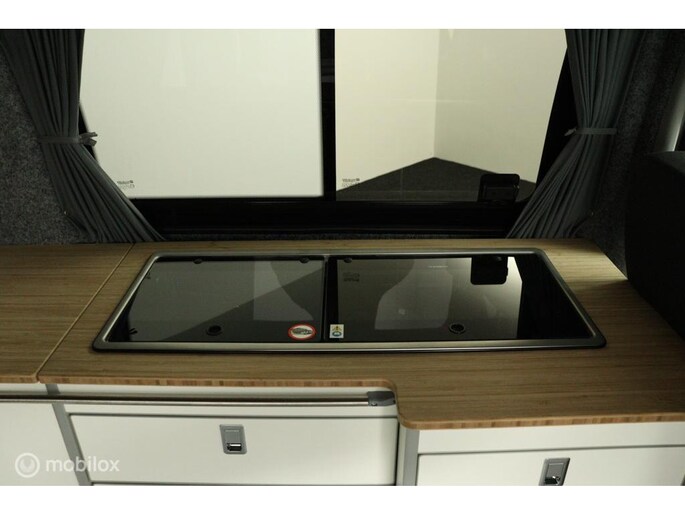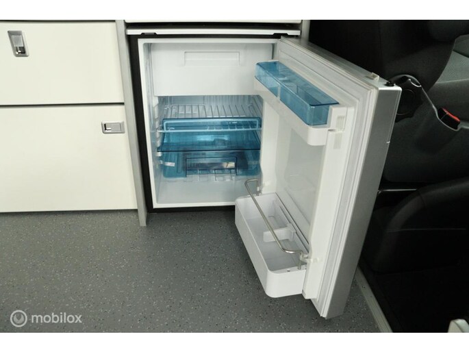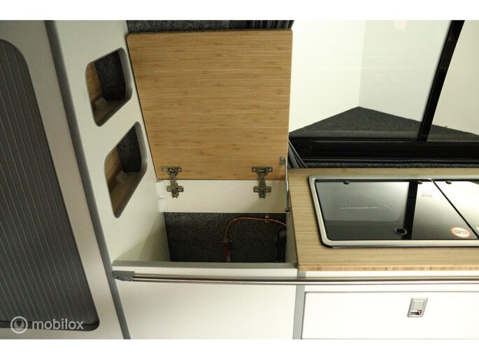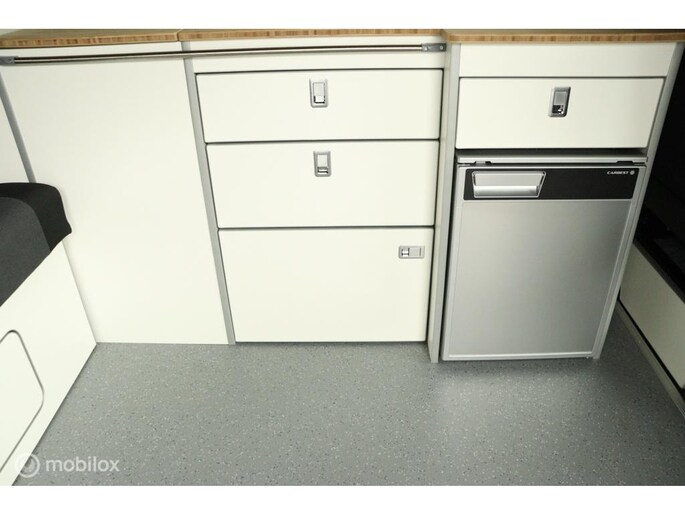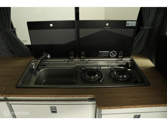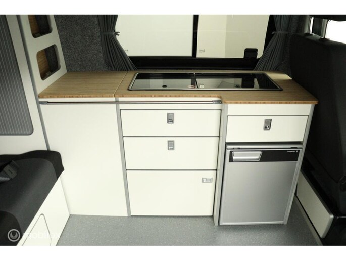 keukenblok bestaat uit een spoelbak met schoon en vuilwater tank en een 2 pits gasstel. Verder een besteklade, dometic compressor koelkast met vriesvakje koelvak heeft een inhoud van 45 liter en verschillende opbergvakjes.