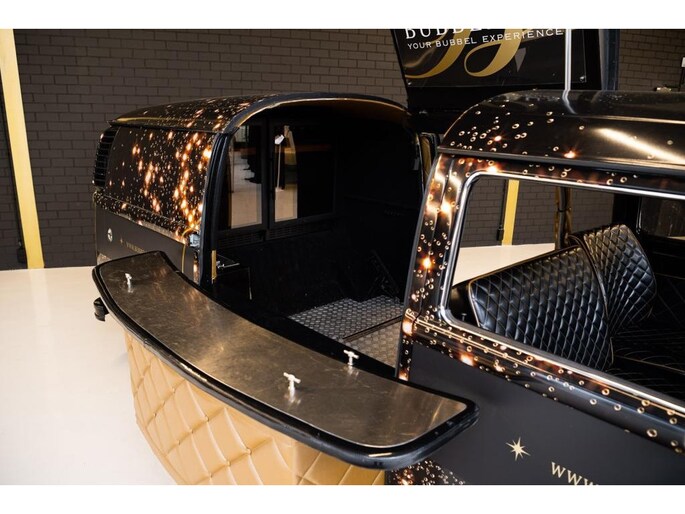 De inrichting is minimalistisch en elegant gehouden, passend bij het luxe karakter van champagne. De Bubbelbus is voorzien van twee wijn-/champagnekoelkasten, zodat flessen altijd op de juiste temperatuur worden geserveerd. Er is één uitgiftepunt, ideaal voor gecontroleerde en stijlvolle service. Een bijzonder detail is de hydraulisch te openen deur, die met een afstandsbediening bediend wordt en zorgt voor een indrukwekkende presentatie bij aankomst.
