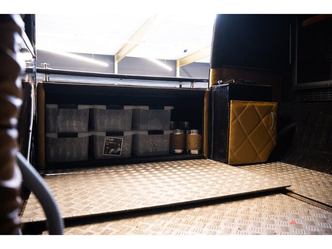 The interior has been designed with a minimalist and elegant approach, perfectly suited to premium champagne service. The Bubbelbus is equipped with two wine/champagne refrigerators, ensuring bottles are always served at the correct temperature. There is one serving point, allowing for controlled and refined presentation. A striking feature is the hydraulically operated service door, which opens via remote control and creates an impressive reveal at any event.