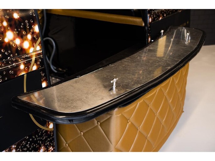 Der Innenraum ist bewusst minimalistisch und elegant gestaltet, passend zum exklusiven Charakter des Champagnerkonzepts. Der Bubbelbus ist mit zwei Wein- bzw. Champagnerkühlschränken ausgestattet, sodass Flaschen stets auf optimaler Temperatur serviert werden. Es gibt eine Ausgabestelle, ideal für eine kontrollierte und stilvolle Präsentation. Ein besonderes Highlight ist die hydraulisch öffnende Servicetür, die per Fernbedienung gesteuert wird und bei Events für einen beeindruckenden Auftritt sorgt.