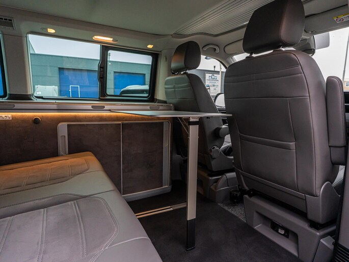 De T6.1 California Ocean is voorzien van een slim en comfortabel slaapsysteem. Het uitklapbare hefdak creëert een royaal tweepersoonsbed bovenin, terwijl de achterbank eenvoudig om te bouwen is tot extra slaapplaats. Binnen enkele minuten verander je van rijdende bus naar volwaardige camper.