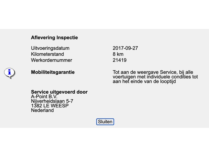 Tenaamstellen en vrijwaren, nieuwe APK bij aflevering, NAP teller-rapport, 6 maanden garantie, afleverbeurt en 40-Puntencheck, complete poets- en onderhoudsbeurt. Dit alles tegen een meerprijs van slechts € 595,- incl. btw.*