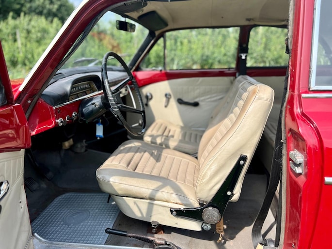 De auto is voorzien van een creme kleurig interieur. Het hemeltje en de deurpanelen zijn in nette staat. Het dashboard dekje verdient wat aandacht, hier zit helaas door de zon een scheur in. Het dashboard is voorzien van een later type (niet originele) radio. Een van de details waaruit blijkt dat dit een later type Amazon betreft is het vlinderstuur.
