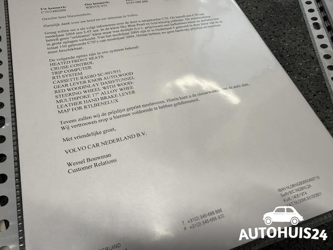 Origineel Nederlands geleverd exemplaar. Nieuw geleverd door Volvo dealer Ton van Kuyk op 16-05-2005. Unieke kleur van modeljaar 2004, waarvan er totaal slechts 150 van zijn geproduceerd en slechts 5 origineel in Nederland nieuw zijn geleverd. Document van Volvo Nederland aanwezig met de aantallen en specificaties vermeld! Er heeft tevens een leuk artikeltje in het Volvo Drive magazine gestaan van deze auto.