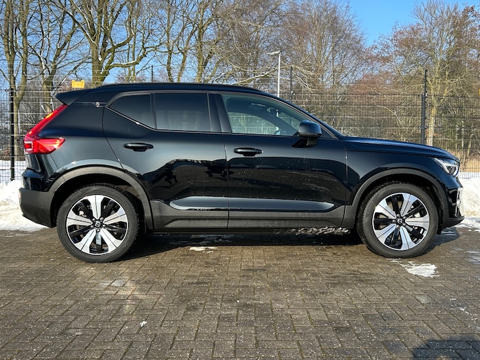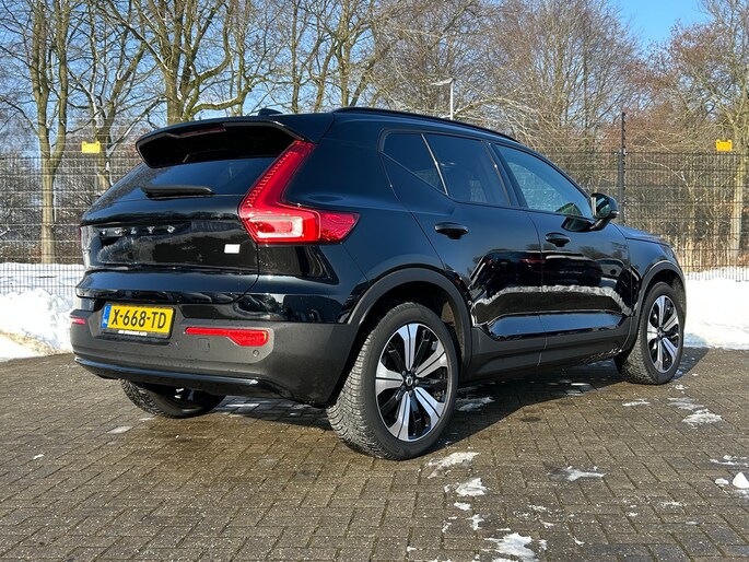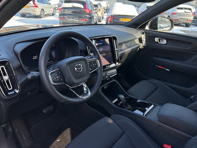 Een nieuw tijdperk breekt aan. Emissievrij rijden is niet langer toekomstmuziek met deze elektrische Volvo XC40. Op een volle acculading kan deze auto de gebruikelijke dagelijkse ritten allemaal maken. Het opladen gaat eenvoudig aan een openbare laadpaal of aan uw eigen oplaadpunt thuis. Een krachtige motor geeft deze auto zijn sportieve prestaties. Een beetje luxe is nooit weg, toch? Vandaar de stoelverwarming! De achterklep opent automatisch met een druk op de knop. Handig als u met volle handen staat. Het verwarmbare stuurwiel is een teken van ultieme luxe. Deze voorziening is een topklasse auto waardig. In deze auto profiteert u onder andere ook van: 19 inch lichtmetalen velgen, LED koplampen, extra getint glas, in delen neerklapbare achterbank, LED-achterlichten en verstelbare lendensteunen. Het digitale dashboard vertelt u onderweg alles dat bijdraagt aan een veilige, efficiënte rit. Kommaar-kommaar-kommaar, aldus de achteruitrijcamera. Iedere centimeter vrije ruimte komt haarscherp in beeld. Schadevrij inparkeren maar! Adaptive cruise control is veilig en comfortabel. De snelheidsregelaar houdt automatisch afstand tot het voertuig dat voor u rijdt. Spraakbediening verhoogt de veiligheid en het gebruiksgemak. De auto luistert naar uw instructies en volgt ze op. Een smartphone met internetverbinding legt eenvoudig overal contact met de auto. U kunt functies activeren en de conditie van de auto monitoren. Deze auto is voorzien van full map navigatiesysteem, achteropkomend verkeer waarschuwing, kruisend verkeer detectie, electronic climate control, draadloos opladen en DAB ontvangst. In deze auto zijn verschillende technologieën aanwezig die voor u het verkeer en de omgeving in de gaten houden en die desnoods ook kunnen remmen of bijsturen. Belangrijk voor uw veiligheid en die van uw passagiers is de verkeersbord-detectie in deze auto. Het Lane-keeping systeem zorgt voor een automatisch constante positie binnen de rijstrook. Afdwalen is uitgesloten. Als een ander voertuig in uw dode hoek rijdt, waarschuwt het systeem met een signaal. De veiligheid van deze auto wordt verder verhoogd door forward collision warning system, hill hold functie, brake assist, vermoeidheidsherkenning en bandenspanningcontrolesysteem. Elektrisch rijden is een verademing. Eén belletje is genoeg voor een proefrit. Wanneer zullen we 'm klaarzetten?