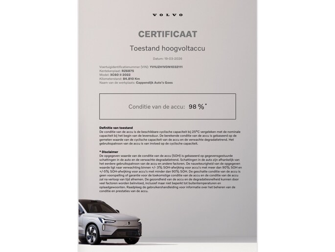 Dit afleverpakket bevat: BOVAG garantie (12 maanden); Geen BOVAG 40-Puntencheck; Geen BOVAG Afleverbeurt; Geen nieuwe APK; 14 dagen omruil garantie, 24 maanden Premium Assistance, 24 maanden Volvo on Call, Controle conform Volvo voorschrift, Gratis tenaamstelling, Gratis zomer-wintercheck, Meest recente software geinstalleerd, Nieuwe APK, Onderhoudsbeurt naar schema fabrikant, Poetsbehandeling, Uitgebreide inspectie (100 punten), Vervangend vervoer bij onderhoud of reparatie, Vervangend vervoer of hotelovernachting bij pech in Europa, Volle tank / accu, Volvo Card met assistance