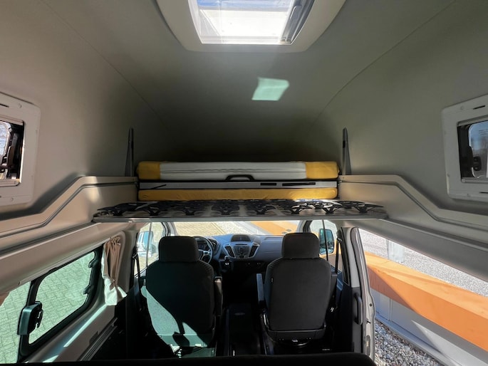 Binnenin biedt de camper comfortabel plaats aan 4 à 5 personen om te slapen en zijn er 5 zitplaatsen met gordels aanwezig – perfect voor gezinnen of reizen met vrienden.