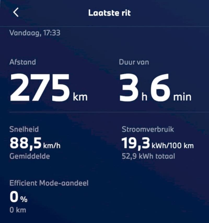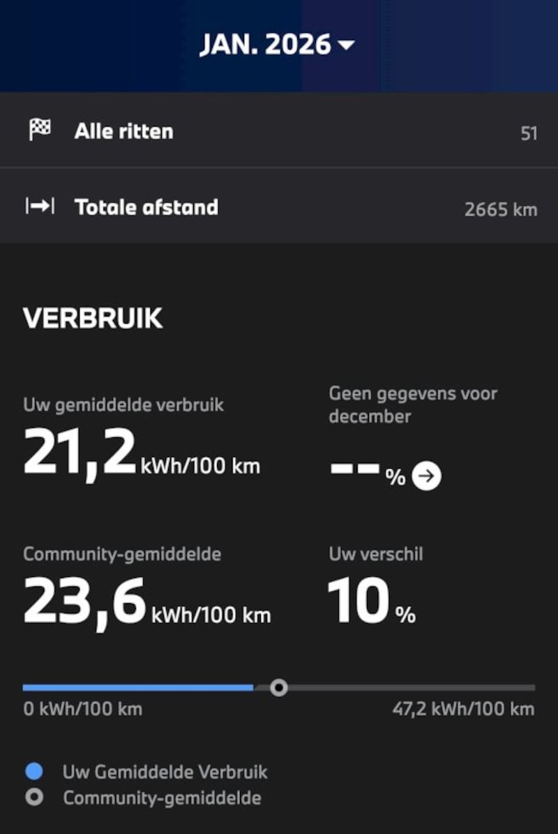 Verbruik: tot nu toe met lange ritten van circa 260 km in de kou en snelheid 110 km/u is nu 21.2 kWh/100 km. Omgerekend met netto capaciteit bereik dan circa 380 km. Ik heb nu 2 maal tot 100% vol geladen, maar dat heb ik niet nodig. 80% volstaat net zelfs met deze kou. Ik kom dan op de bestemming met 10% tot 20%. Wind tegen/mee.