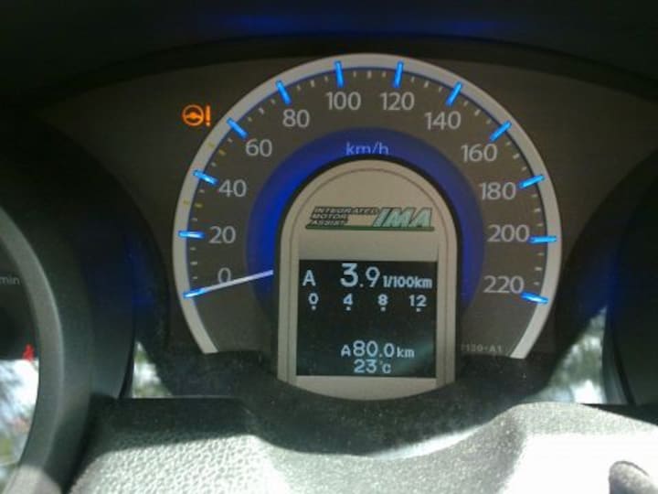 +BrandstofVerbruik : De eerste 100 km 5.9L/100km (1:17) vanwege het spelen met de schakelflippers, wegligging- en acceleratie testen. De laatste 3 ritten 5.0L/100km (1:20). Dit is iets slechter dan de fabrieksopgave (1:22) maar ik heb niet mijn best gedaan om zuinig te rijden. Mbv de ECOmeter kan je zien of je zuinig bezig bent, en het verrassende is, dat het niet in het optrekken zit. Door de CVT en het forse extra koppel van de electromotor kan je moeiteloos in het 'groene' gebied blijven, en toch soepel met het verkeer meerrijden. Het truukje zit in het afremmen! De electromotor kan maximaal 15kiloWatt rem-energie terugvoeren in de akku, en dat heb je al snel te pakken. Op tijd beginnen met remmen is het devies, je passagiers zullen je trouwens ook dankbaar zijn. Als je harder remt, gaan de remblokken ook meewerken, en die energie ben je kwijt. Wel confronterend dat een 'niet hybride' auto bij elke afrit van de snelweg zoveel energie verspilt dat je er een huis van kan warmhouden.