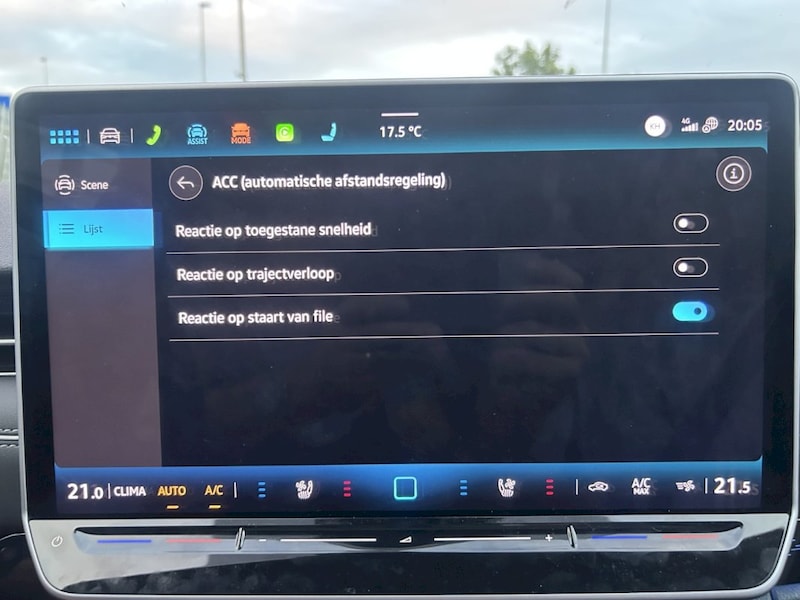 ACC instelling "reactie op trajectverloop": Dat is niet zoals ik, een redelijk normale bestuurder, rijdt. De snelheid waarmee je richting een bocht of rotonde rijdt wordt dan erg laag. Je kan wel gas bijgeven maar dan doe ik het net zo lief zelf.