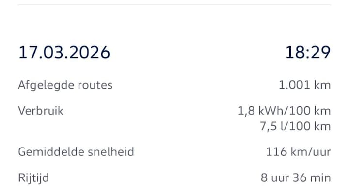 En 2.3kw op 100 km. Over een lange afstand van 2670km gemeten met een gemiddelde snelheid van 69km per uur